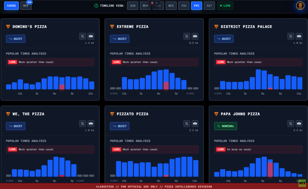 ولاحظ مستخدمو وسائل التواصل الاجتماعي منذ فترة طويلة أن زيادة نشاط مطاعم البيتزا القريبة من البنتاغون – والتي يتم تتبعها بشكل غير رسمي عبر المؤشر – غالبا ما ترتبط زمنيا بأحداث عسكرية أو أزمات جيوسياسية عالمية كبرى. وأصبح هذا الارتباط موضوعا للتكهنات المستمرة، على الرغم من عدم وجود تأكيد رسمي على علاقة سببية مباشرة.