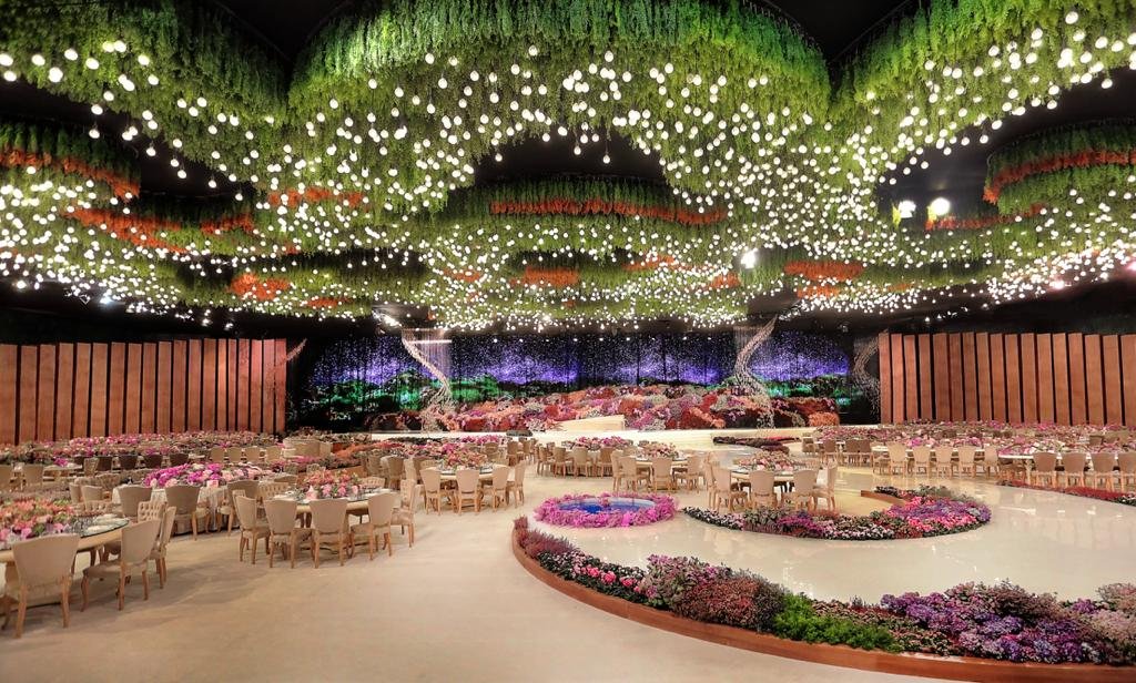 Le Mariage wedding design took part in no small measure in creating such a spectacular event in collaboration with the worlds’ best professionals of the wedding industry. Together, they created something that has never been done before. A large space of over 18000 square meters was built specifically for the occasion to host around 15000 guests including many celebrities from all around the world. The team of architects and designers created magical, unforgettable, unique, and whimsical designs. It took 35 days to execute. Three large ballrooms were completely transformed, each with its own theme, layout and decorations.