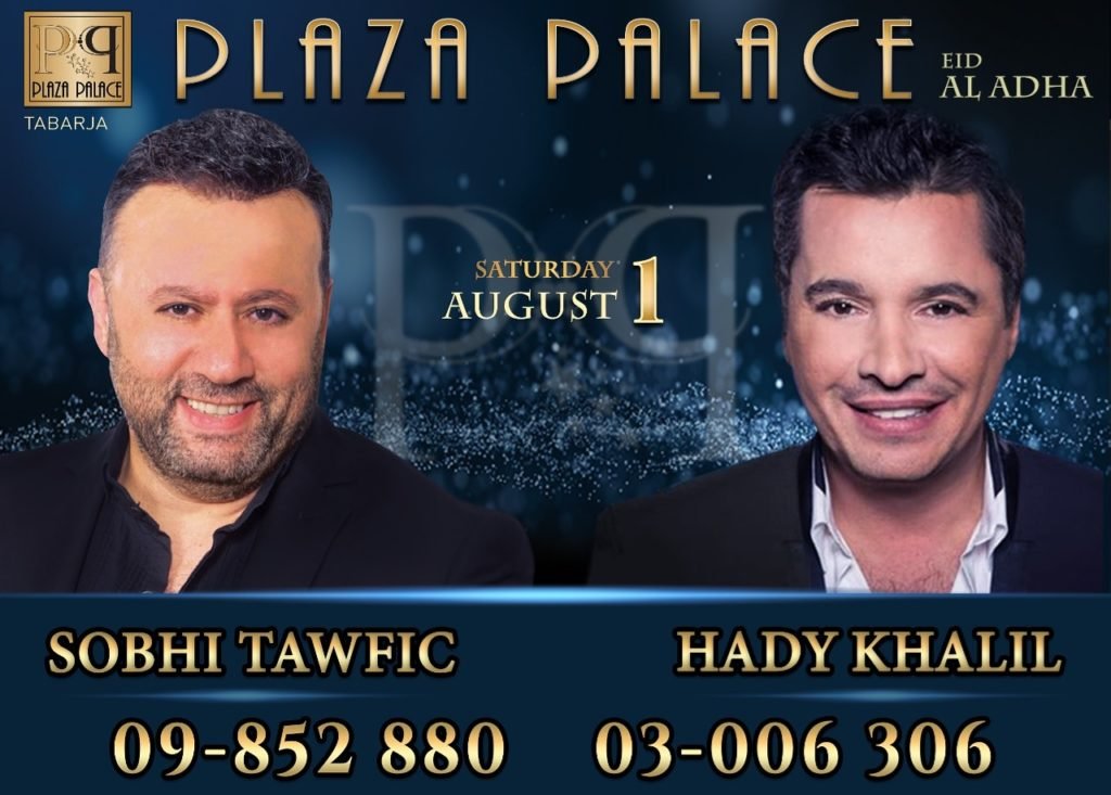 إعتاد رواد مطعم بلازا بالاس على السهرات الراقية والجميلة والمميزة ، إدارة المطعم ممثلة بالسيد روبير مخلوف حريصة دائماً وكل الحرص على أن يكون الزبون سعيداً بالاجواء دون أن يشعر بالملل ، هذا إضافة الى تقديم افضل مائدة طعام بجودة عالية ، بعد نجاح حفل ربيع جميل وهادي خليل يستعد السيد روبير لتنظيم سهرة مميزة تجمع بين الطرب الاصيل والصوت الجميل ، بحضور الكبير صبحي توفيق نستمتع بأجمل الاغاني الطربية والقدود الحلبية وبصوت هادي خليل وأغانيه الجميلة يراقص الحضور وبرفقة فرقة الخياله التي تضفي اجواء جميلة على السهرة ، اذا السبت القادم في ١ اب اي في مناسبتين جميلتين عيد الجيش الذي يصادف بتاريخ ١ اب وعيد الاضحى المبارك أنتم على موعد مع اجمل سهرة في بلازا بالاس