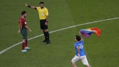 مشجع يقتحم ملعب مباراة البرتغال والأوروغواي بعلم “الميم”..